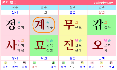 작고 맑은 물인 계수가 흙에 스며드는 경우라, 부부간에 인연도 있고, 음양이 조화되어 정도 있다고 봅니다. 그러나, 일지가 흉신이면서 남편성인 월간 무토는 일간 계수와 무계합을 이루지만, 월지 진토의 지장 중에 중기인 계수와도 무계합을 이루어, 배우자의 외도가 신경이 쓰입니다.