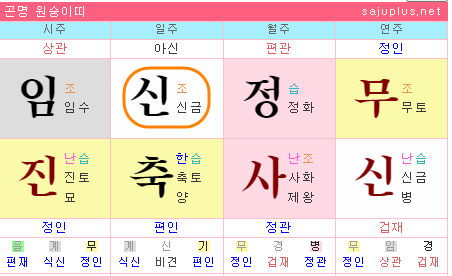 엄하고 까다로운 남편이 일지에서 간섭을 하는 경우로, 다소 힘든 결혼 생활이 되기 쉽고, 남자로 인해 정신적으로나 육체적으로 시달리기 쉽습니다. 또한, 일지 신금은 편관으로 일간과 음양이 조화되지 못해 다정다감한 면모도 기대하기 힘듭니다.