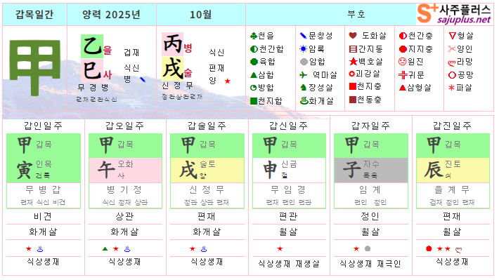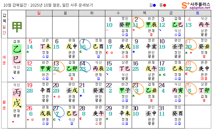 갑목일간의 2025년 10월달 일진입니다. 중요한 날, 특히 주의해야 하는 날만 표시해 드리니, 하단의 합,충,형,원진 등의 도표와 첨부한 링크를 참조하셔서 확인하시기 바랍니다.