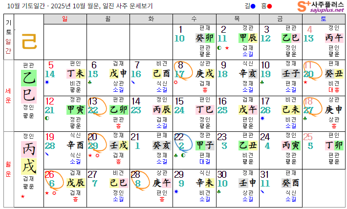 기토일간의 2025년 10월달 일진입니다. 중요한 날, 특히 주의해야 하는 날만 표시해 드리니, 하단의 합,충,형,원진 등의 도표와 첨부한 링크를 참조하셔서 확인하시기 바랍니다.