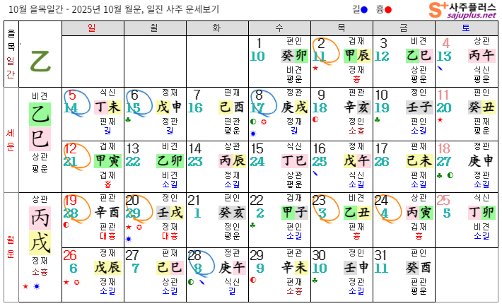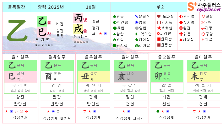 을목일간의 2025년 10월달 일진입니다. 중요한 날, 특히 주의해야 하는 날만 표시해 드리니, 하단의 합,충,형,원진 등의 도표와 첨부한 링크를 참조하셔서 확인하시기 바랍니다.