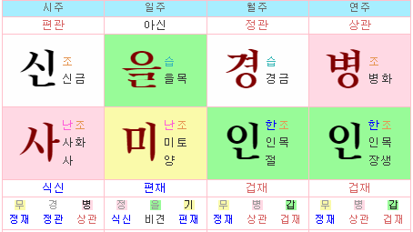 상관합살은 말로써 살의 기운을 순화시키는 것이라 사교술로 볼 쑤도 있습니다. 또한, 연간이 시간과 합을 하는 관계라 조부가 손자에 대한 사랑이 극진할 수도 있고, 어려운 상황은 언변이나 임기응변으로 혜쳐나갈 수 있는 능력이 있다고 봅니다.