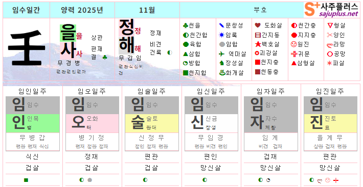 임수일간의 2025년 11월달 일진입니다. 중요한 날, 특히 주의해야 하는 날만 표시해 드리니, 하단의 합,충,형,원진 등의 도표와 첨부한 링크를 참조하셔서 확인하시기 바랍니다.