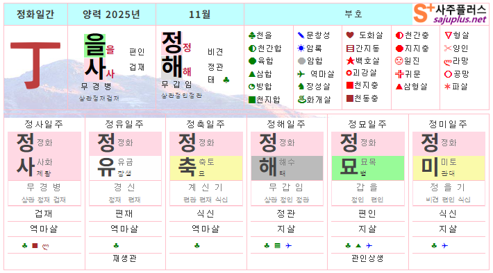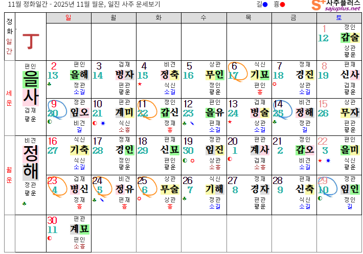 정화일간의 2025년 11월달 일진입니다. 중요한 날, 특히 주의해야 하는 날만 표시해 드리니, 하단의 합,충,형,원진 등의 도표와 첨부한 링크를 참조하셔서 확인하시기 바랍니다.