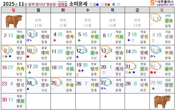 ○ 공망 : 7일, 8일, 19일, 20일 (노력에 비해 결실 부족)