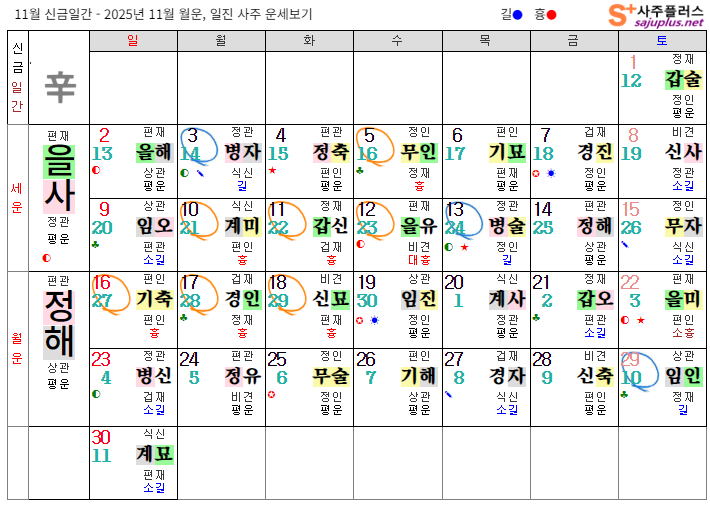 신금일간의 2025년 11월달 일진입니다. 중요한 날, 특히 주의해야 하는 날만 표시해 드리니, 하단의 합,충,형,원진 등의 도표와 첨부한 링크를 참조하셔서 확인하시기 바랍니다.