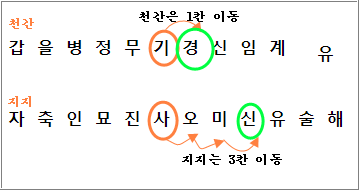 좀더 간편하고 쉽게 알아보는 방법은 사주의 월간에서 한칸 다음 자리로 이동하여 천간으로 하고, 월지에서 세자리 다음으로 이동하여 지지로 합니다.