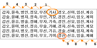 위의 예에서 생월이 [己巳 기사]월 이라면 위 60갑자 표시에서 [기사]를 찾고 [기사]부터 9칸 이전 부분을 찾습니다.