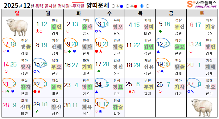 ○ 공망 : 1일, 2일, 13일, 14일, 25일, 26일 (노력에 비해 결실 부족)