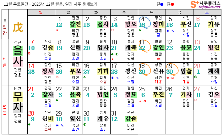 무토일간의 2025년 12월달 일진입니다. 중요한 날, 특히 주의해야 하는 날만 표시해 드리니, 하단의 합,충,형,원진 등의 도표와 첨부한 링크를 참조하셔서 확인하시기 바랍니다.