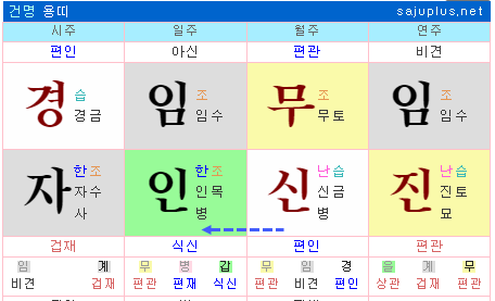 그러나, 식신이 관성을 극하는 것을 제어하게 됨으로 인해, 직관력이나 탐구심이 강해지게 됩니다. 또한 관인 상생으로 직업운이나 문서운이 좋아집니다. 학문이나 연구 기획에 탁월한 재능이 나타나게 되고, 학자나 교육자로 대성할 수도 있습니다.