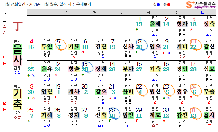 정화일간의 2026년 1월달 일진입니다. 중요한 날, 특히 주의해야 하는 날만 표시해 드리니, 하단의 합,충,형,원진 등의 도표와 첨부한 링크를 참조하셔서 확인하시기 바랍니다.