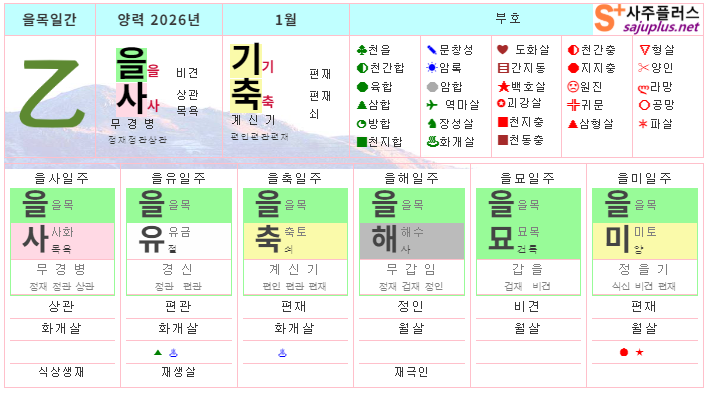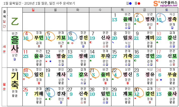 을목일간의 2026년 1월달 일진입니다. 중요한 날, 특히 주의해야 하는 날만 표시해 드리니, 하단의 합,충,형,원진 등의 도표와 첨부한 링크를 참조하셔서 확인하시기 바랍니다.