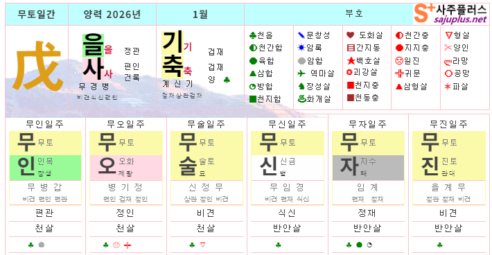 무토일간의 2026년 1월달 일진입니다. 중요한 날, 특히 주의해야 하는 날만 표시해 드리니, 하단의 합,충,형,원진 등의 도표와 첨부한 링크를 참조하셔서 확인하시기 바랍니다.