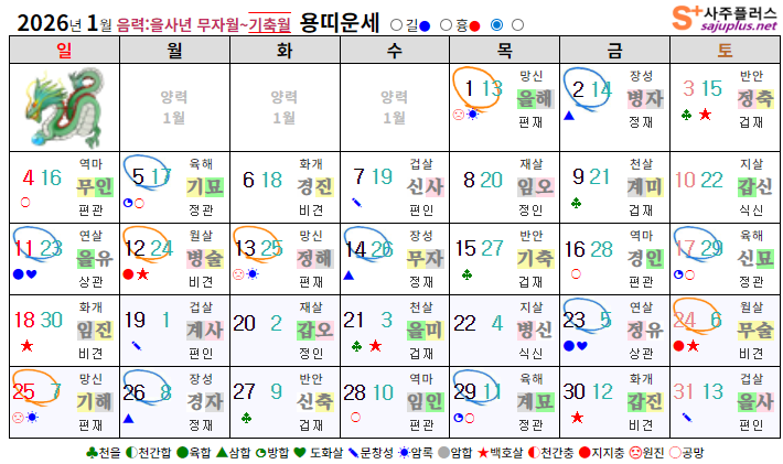 ♣ 천을 : 3일, 9일, 15일, 21일, 27일 (힘든 순간 주변의 도움)