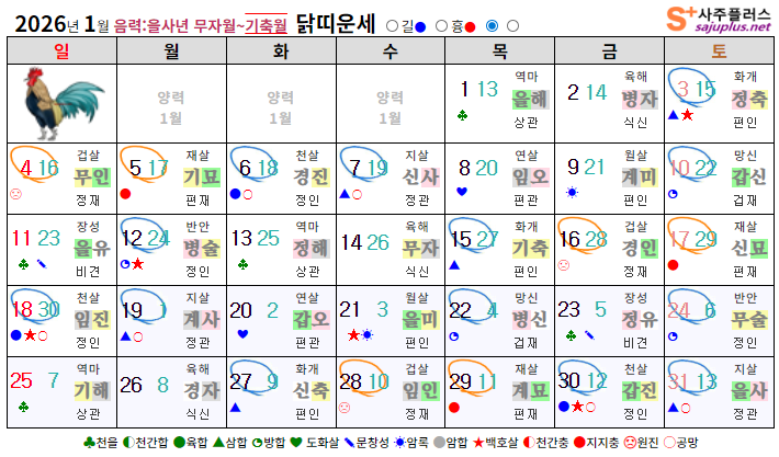 ♣ 천을 : 1일, 11일, 13일, 23일, 25일 (힘든 순간 주변의 도움)