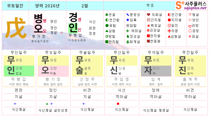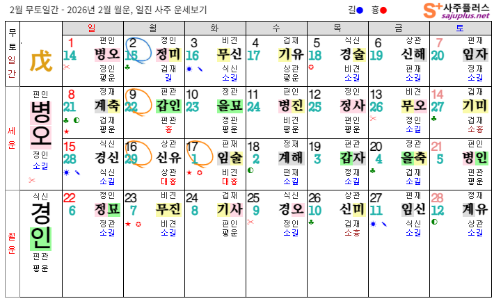 무토일간의 2026년 2월달 일진입니다. 중요한 날, 특히 주의해야 하는 날만 표시해 드리니, 하단의 합,충,형,원진 등의 도표와 첨부한 링크를 참조하셔서 확인하시기 바랍니다.