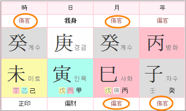 위의 경우는 상관이 무려 4개나 되는 사주입니다.