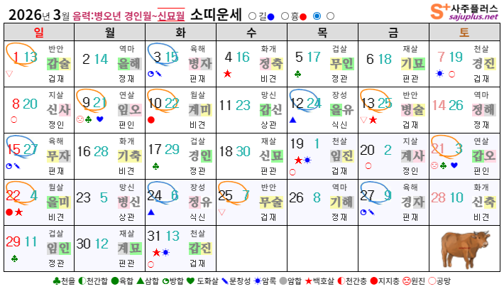 ○ 공망 : 7일, 8일, 19일, 20일, 31일 (노력에 비해 결실 부족)