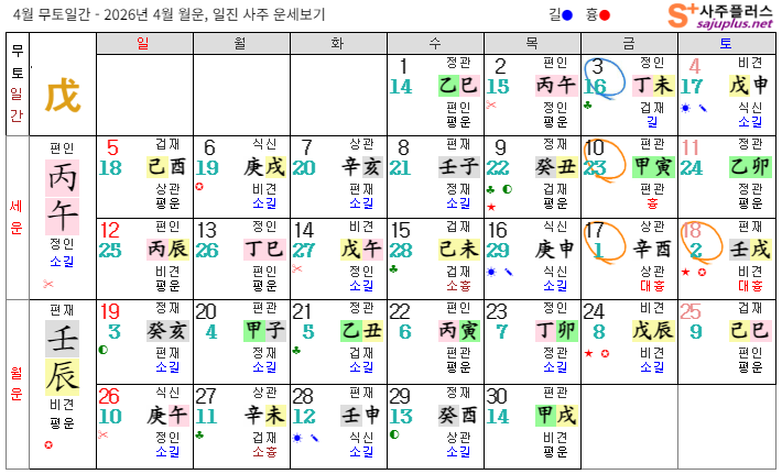 무토일간의 2026년 4월달 일진입니다. 중요한 날, 특히 주의해야 하는 날만 표시해 드리니, 하단의 합,충,형,원진 등의 도표와 첨부한 링크를 참조하셔서 확인하시기 바랍니다.