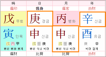 여기서도 화 오행이 고립된 경우지만 화가 극하는 오행인 금으로 둘러 쌓인 경우라 위의 경우보다는 흉의가 다소 약하다고 봅니다.