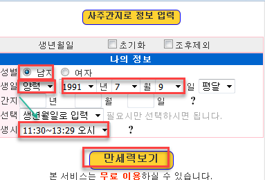 모든 선택이 다 되었으면 [만세력보기]를 클릭하여 만세력을 봅니다.