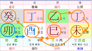 년지 미토는 시유합으로 금이의 오행이 된 월지와 일지를 동시에 생하게 되고,