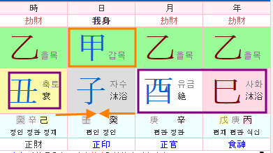 월지가 축토로 상관이면 일간이 생하는 오행으로 일간의 힘을 뺍니다.