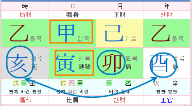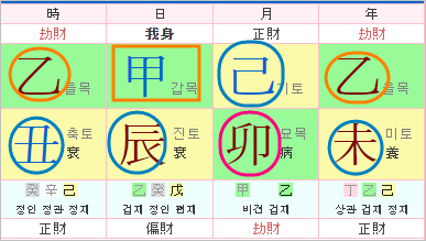 연간 을목은 겁재가 되고 월지 묘목은 겁재로 양인살이 됩니다.