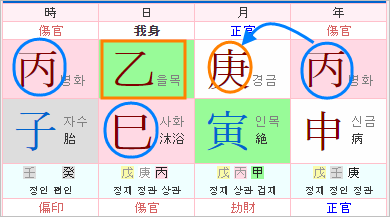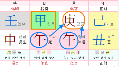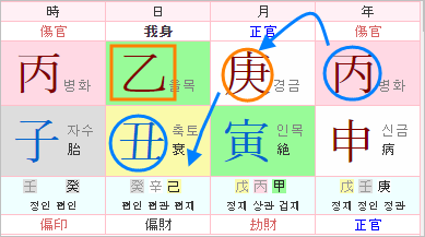 거기다 년편성인 월간 정관은 상관인 년간 병화의 극을 바로 받게 됩니다.