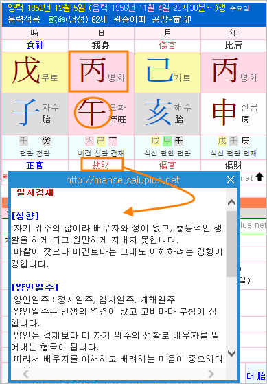 .위 화면처럼 병화의 일지인 오화 아래에 있는 겁재를 클릭하시면 내용이 자세히 나옵니다.