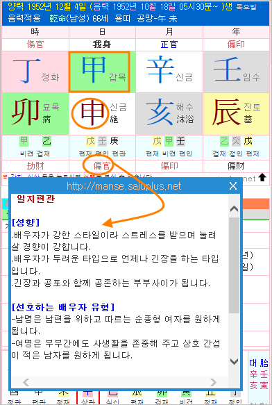클릭하시면 위 화면처럼 편관인 배우자와 어떤 사이가 되는 지 나열됩니다.