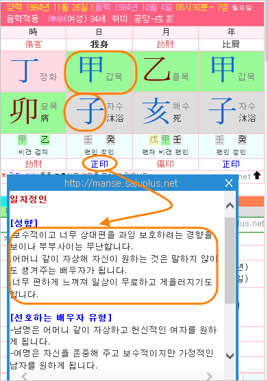 여기서도 마찬가지로 갑목의 지지 자수아래에 있는 육친 정인을 클릭하시면 해당 자료가 나오게 됩니다.