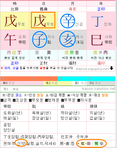 월지가 해수로 일간 무토의 입장에서 일간이 극하는 재성으로 일간의 힘을 빼는 오행이네요.