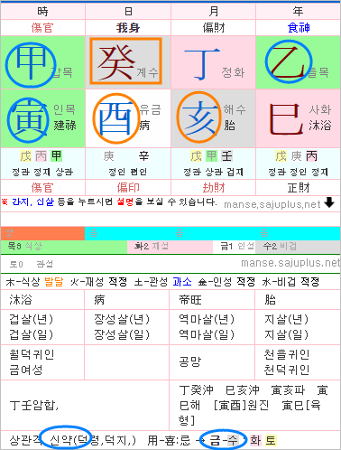 위 명조는 해월의 계수일간으로 월지 해수는 같은 오행인 겁재로 도움을 받고 있고, 일지 유금은 인성으로 일간을 생조하여 힘을 더해 주고 있습니다.