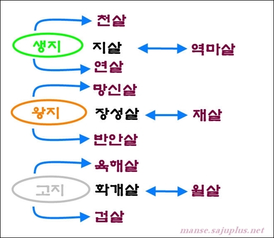 .겁살부터 시작하여 재살, 천살, 지살,연살, 월살,망신살, 장성살, 반안살, 역마살, 육해살 화개살 등으로 나뉘어 집니다.