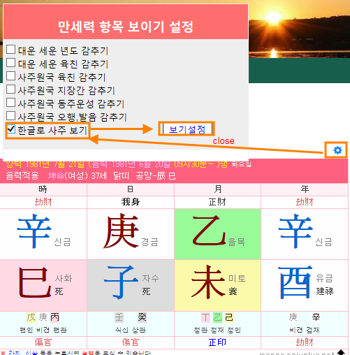 여기서 제일 하단에 있는 [한글로 사주보기]를 체크한 다음 [보기설정]을 클릭합니다.