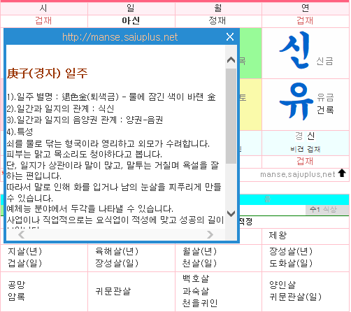 사주팔자는 물론 각종 신살 대세운까지 궁금한 부분의 글자가 있으면 해당 글자를 누르시변 위 화면처럼 해설이 나오게 됩니다.