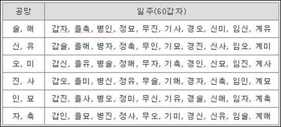 갑자일주의 공망일은 [술]. [해]가 됩니다.