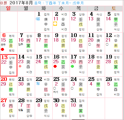 2017년 8월에서 길일을 찾는다고 가정해 봅니다.
