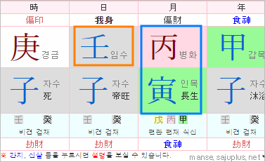 월간의 병화는 다시없는 소중한 불기운으로 용신이되고 월지 인목 또한 병화의 기운을 이어주는 소중한 나무가 됩니다.