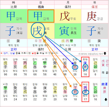 더구나 16세 경진대운에서는 17세부터 18세는 세운도 경진년, 정사는으로 라먕살이 겸치게 됩니다.