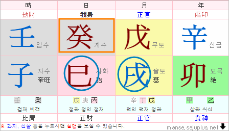 .일지에 戌,亥(술,해)가 있고 대운이나 세운에서 辰,巳(진,사)가 오는 경우가 있을 수 있습니다.