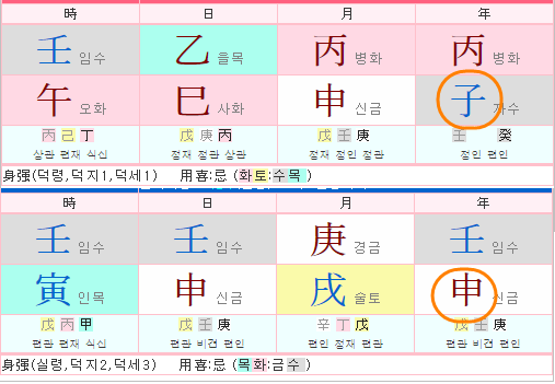 참고로 위 명조는 단순히 연지이 삼합만을 보여 드린 것으로 위의 경우가 궁합이 좋다는 것과는 무관 합니다.